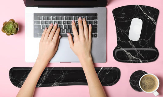 Ergonomic Mouse Pad with Wrist Rest Support and Keyboard Wrist Rest Set with Coaster, Cute Wrist Pad with Non-Slip Rubber Base and Raised Memory Foam, Easy Typing & Pain Relief, Black White Marble